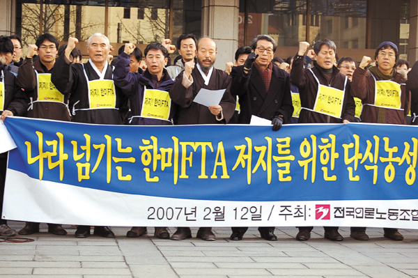 언론노조는 12일 서울 프레스센터 앞에서 기자회견을 열고 한·미 FTA 7차 협상이 시작된 이날부터 15일까지 소속 조합원 80여명이 한·미 FTA 저지를 위한 단식농성에 들어간다고 밝혔다.