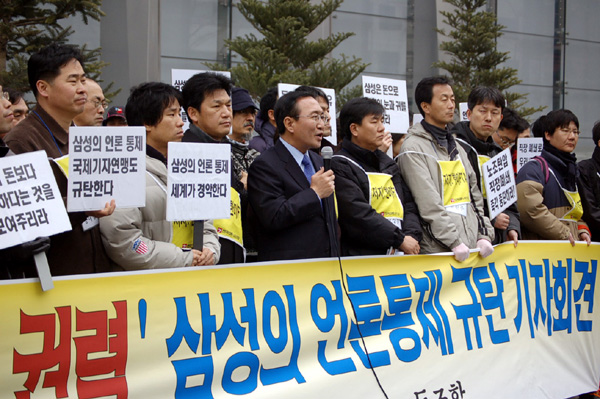 언론노조(위원장 신학림)가 13일 오후 태평로 삼성 본관 앞에서 주최한 ‘자본권력 삼성의 언론통제 규탄’ 기자회견에서 민주노동당 노회찬 의원은 이같이 말하며 삼성관련 기사를 삭제한 금창태 사장을 비판했다.