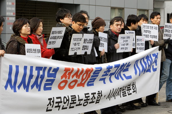 시사저널 노조는 8일 오전 서울 용산 서울문화사 앞에서 기자회견을 열어 “회사는 협상이 난항을 겪고 있는데도 사태가 곧 해결될 것처럼 독자들을 호도하고 지난 1월29일에는 노조집행부 전원을 고발했다”고 밝혔다.