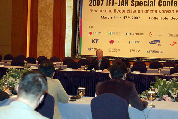 IFJ특별총회 이틀째인 13일 한국기자협회 정일용 회장은 소공동 롯데호텔 크리스탈 볼룸에서 열린 발표에서 북한뿐 아니라 전세계에서 핵무기를 폐기해야 한다고 주장했다.