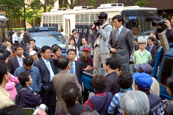 ▲ 석간무가지결사반대투쟁위원회 박종로 위원장이 2일 ‘시티신문’ 배포차량에 올라서서 발송반대 시위를 벌이는 한편, 총·중판업자들에게 투쟁의지를 호소하고 있다. |