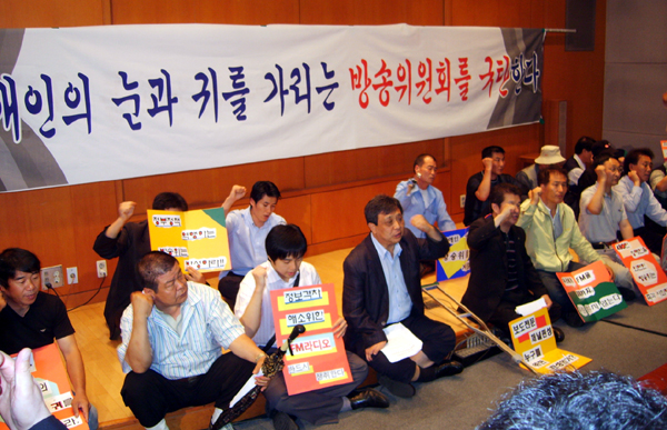 이들은 수 년 동안 요구해온 장애인 FM 방송을 보도전문 채널로 한정해 놓은 방송위원회의 정책에 항의하며 “먼저 보도전문편성 지상파 라디오 사업자 선정 공청회를 취소하고 신규채널 사용 방법에 대한 공청회를 열라”고 촉구했다.