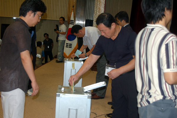 ▲ 전국언론노동조합은 7일 서울 여의도 중소기업회관 대회의실에서 대의원대회를 열고 최상재 위원장, 김순기 수석부위원장을 선출했다. 사진은 투표함에 용지를 넣고 있는 한 대의원. |