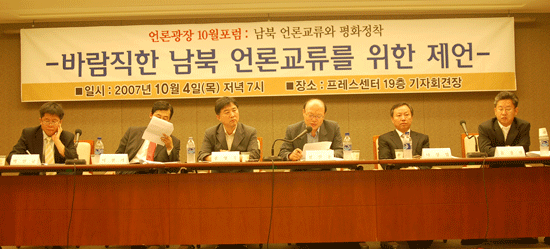 이날 발제를 맡은 정일용 한국기자협회장은 정상회담 기간 열린 사회단체 언론 간담회에서 북측이 ‘남측 보도는 편파적이며 반북 기사가 많다’며 남측 언론보도에 대한 불만을 표시한 것을 예로 들며 “일부 신문이 객관적으로 보면 이상할 것이 없는 사안을 색안경을 끼고 보면서 남북 언론교류를 어렵게 하고 있다”고 지적했다.