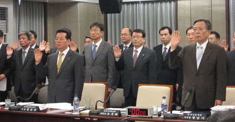 ▲ 22일 프레스센터에서 열린 국회 문화관광위원회 국정감사에서 증인으로 나온 언론단체장과 관계자들이 선서를 하고있다. |