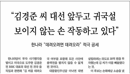 동아 역시, 15일 기사 제목을 〈“김경준 씨 대선 앞두고 귀국설 보이지 않는 손 작동하고 있다”〉라고 뽑아 한나라당의 입장을 그대로 게재했다. 김경준 씨 송환 지연에 대한 범여권과 한나라당의 정치 공세를 보도하며 BBK 의혹 해소와는 거리가 먼 ‘한나라당’의 입장을 충실히 반영하고 있다. BBK사건은 한나라당이 대선을 2개월 여 앞두고 정치적으로 공격을 받고 있는 사건으로 규정한 것이다.