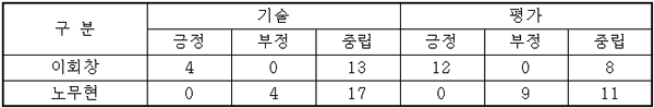 이와 같은 방식으로, 이후보를 긍정적으로 기술하고 있는 문장이 4건이었고, 노후보를 긍정적으로 기술하는 문장은 아예 한 건도 없다. 반면에 부정적으로 기술한 문장을 보면 노후보 경우 4건이 있었지만, 이후보 경우는 한 문장도 없었다. 따라서, ‘사실을 진술’하는 기술에 있어서 조선일보는 이 후보를 일방적으로 편들고 있는 것이다