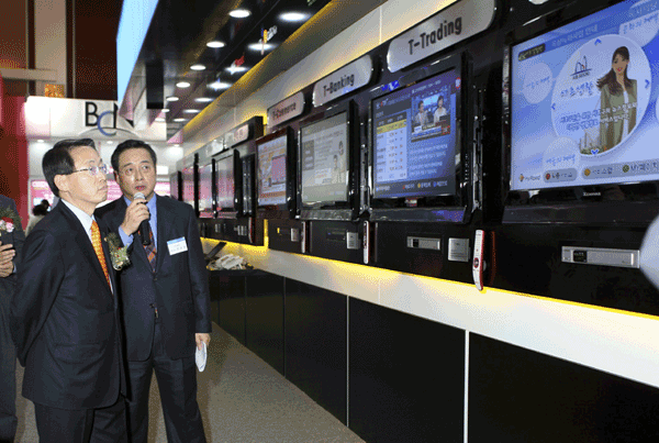 ▲ 28일 잠실 롯데호텔에서 열린 BcN성과전시회에서 유영환 정보통신부 장관이 케이블BcN 서비스에 대한 설명을 듣고 있다. |