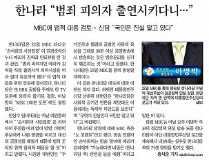 3. 한나라당의 ‘언론 길들이기’, 당신들은 언론이 아닌가? 지난 23일 한나라당 심재철, 정병국, 장윤석, 이재웅, 김학원 의원 등이 MBC에 방문하였다. 이유는 BBK 보도와 지난 22일 MBC 라디오 <손석희의 시선집중>에서 에리카 김과 진행한 인터뷰를 문제 삼으며 ‘항의’ 방문을 한 것이다. 이와 더불어 한나라당 이명박 후보 측은 “BBK 공방 중심의 TV토론에 일체 응하지 않을 것”이라며 지난 22일 예정되어있던 MBC <100분 토론> BBK 공방 편에 당일 불참을 통보하였다. 문제는 여기에 그치지 않는다.