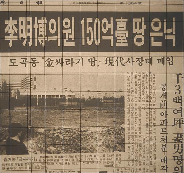 1993년 3월27일 작성된 이 기사는 도곡동 땅의 실소유주가 이명박 후보임을 밝힌 기사. BBK에 190억원을 투자한 (주)다스의 자금이 도곡동땅 매각 대금으로부터 나온 것이라는 주장과 연관돼 상당한 파장을 낳고 있다.