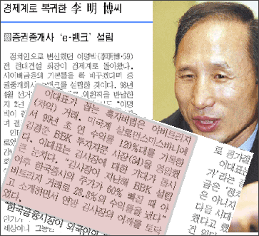 “이 회사의 모기업격인 LKe 뱅크가 이미 설립돼 있으며 그 아래 종합자산관리 전문회사인 BBK란 ‘자회사’도 영업중에 있다. 물론 이들 회사에서 이(명박) 전의원은 대주주로서 경영에도 참여하고 있다” (중앙일보 2000년 10월14일자)