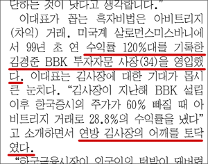 따라서 ‘기사 내용을 제대로 확인해야’ 할 쪽은 동아일보다. 당시 동아의 보도는 이렇다. “미국계 살로먼스미스바니에서 99년초 연 수익률 120%대를 기록한 김경준 BBK 투자자문사장(34)을 영입했다. 이 대표는 김사장에 대한 기대가 몹시 큰 눈치다. “김사장은 지난해 BBK 설립 이후 한국증시의 주가가 60% 빠질 때 아비트리지 거래로 28.8%의 수익률을 냈다”고 소개하면서 연방 김사장의 어깨를 토닥였다” (동아일보 2000년 10월16일자)