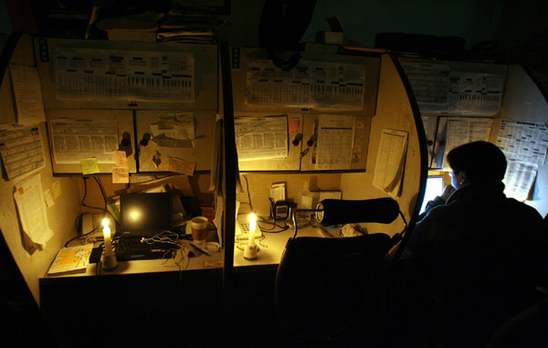 ▲ 서대문 미근동 경찰청 기자실. 전기차단 등 사실상 기자실 폐쇄조치가 이뤄진 가운데 기자들이 촛불을 켜고 기사를 작성하고 있다.(연합뉴스) |