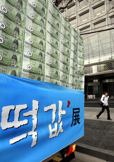 ▲ 가짜 만원짜리 지폐를 붙인 차량들이 지난 17일 오전 태평로 삼성 본관 앞에 멈춰서 있다. '떡값'전으로 명명된 이 차량 퍼포먼스는 한 미술가가 삼성 비자금 사건과 관련해 재벌 등의 부정 비리 등을 고발, 풍자하기 위해 개최했다.(연합뉴스) |