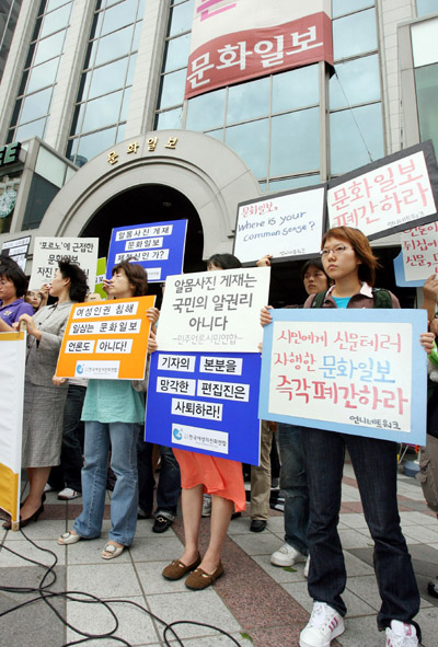 ▲ 여성 및 인권시민단체 소속회원들이 문화일보 사옥 앞에서 신정아씨 누드사진 게재와 관련, 항의집회를 하고 있다.(연합뉴스) |
