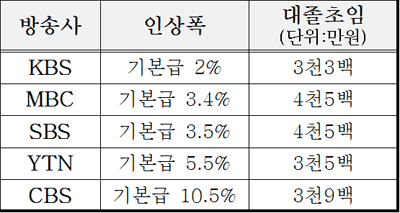 방송사들은 지난해 말 임금 및 단체협상을 통해 적게는 2%~10%(기본급 기준)임금을 인상했다. 가장 많은 임금 인상을 보인 곳은 CBS다. CBS 노사는 지난해 11월 임금협상을 통해 7백%였던 상여금을 2백% 인상했다. 이는 기본급을 기준으로 10.5%를 올린 셈이 된다. CBS 한 관계자는 “몇 년간 사실상 임금이 동결되고 노컷뉴스 등 업무량을 늘어, 조금 큰 폭으로 진행됐다”고 말했다.