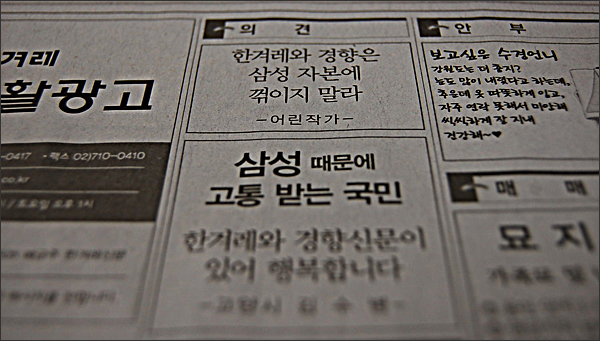 24일 한겨레 생활광고란에 첫 독자 격려광고가 게재됐다. “삼성 그들이 진정 변할 때까지는 국민의 힘으로 독자의 힘으로 한겨레를 지켜 나갔으면 좋겠습니다”라는 문구였다.