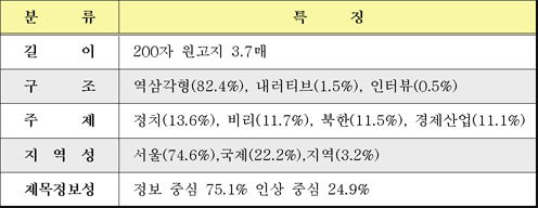 기사 구조는 주제 정보를 압축한 형태로 리드를 구성한 뒤에 정보의 중요도에 따라 순서대로 나열하는 역삼각형 기사가 82.4%로 절대적이었다. 그러나 2004년부터 새로운 기사체로 주목받고 있는 내러티브 기사와 인터뷰 기사가 증가추세를 보였다.