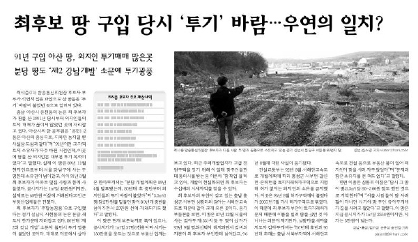 △ 최시중 후보자의 땅 투기 의혹을 보도한 한겨레 6일자 6면. 최 후보자가 땅을 사들일 당시는현지에 투기열풍이 불었으며 구입 과정이 일부 실정법에도 어긋낫다고 썼다. |