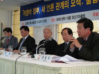 이같은 주장은 한국기자협회와 한국방송학회가 4일 서울 프레스센터 18층 외신기자클럽 라운지에서 ‘이명박 정부, 새언론관계의 모색:출입처와 기자실 개선방안’이라는 주제로 연 세미나(사진 아래)에서 나왔다.