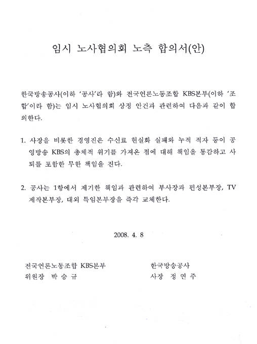 전국언론노동조합 KBS본부(위원장 박승규)는 10일 특보에서 정연주 사장을 비롯한 경영진의 사퇴를 포함, 무한책임을 요구하는 노사합의서(아래 사진) 전달에 실패했다며 “정 사장이 KBS의 미래에는 관심도 없고 자리에만 집착하고 있다”고 주장했다.