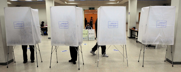 ▲ 지난 9일 제18대 국회의원 선거일에 서울 영등포문화회관 영등포1동 제1투표소에서 주민들이 투표를 하고 있다. 이번 선거는 투표율 46%를 기록, 유권자 두명 중 한명은 투표를 안 한 역대 최악의 선거가 됐다. |