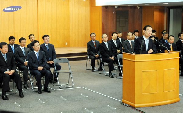 | ▲ 이건희 삼성그룹 회장이 22일 오전 삼성그룹 본관 지하1층 국제회의실에서 삼성그룹 경영쇄신안을 발표하며 그룹 일선에서 물러나기로 했다고 발표하고 있다. ⓒ뉴시스 | ||