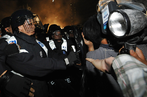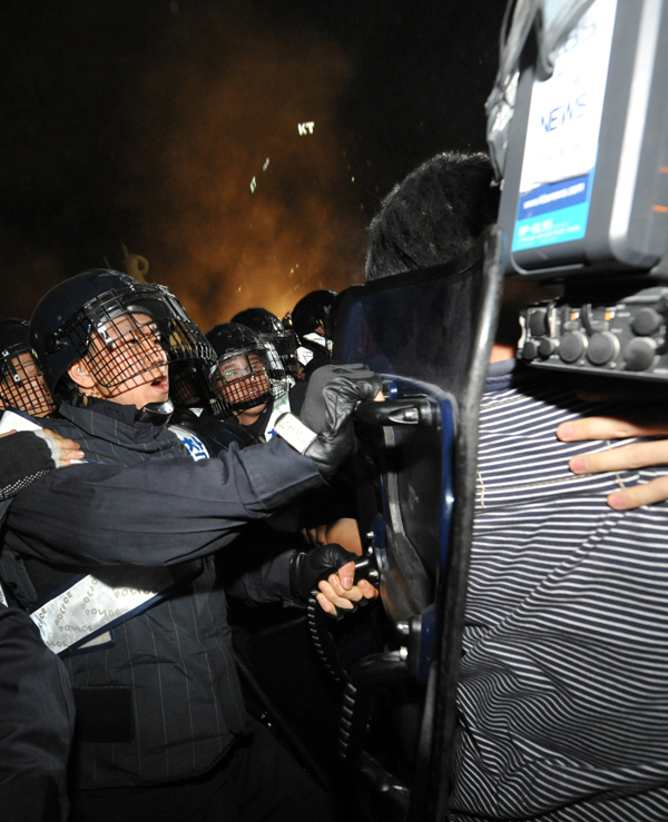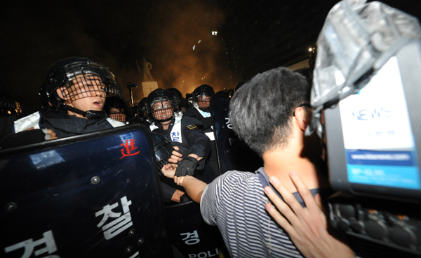 | ▲ / 방패로 취재진 가격하는 경찰 / 미국산 쇠고기 수입반대를 위한 촛불문화제를 마친 시민들이 2일 새벽 서울 세종로 사거리에서 가두시위를 하고 있는 가운데 방송국 취재진이 경찰에게 폭행당하고 있다. ⓒ뉴시스 | ||