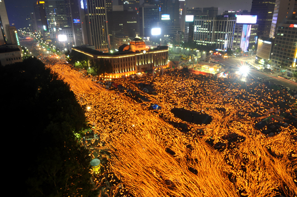 | ▲ 거리를 가득 메운 시민들의 촛불 / 7일 저녁 서울광장에서 출발한 '72시간 릴레이 촛불문화제' 참가자들이 명동 방향으로 행진을 하고 있다. ⓒ뉴시스 | ||
