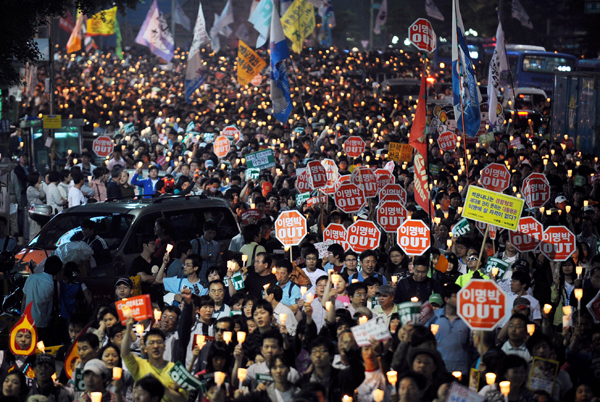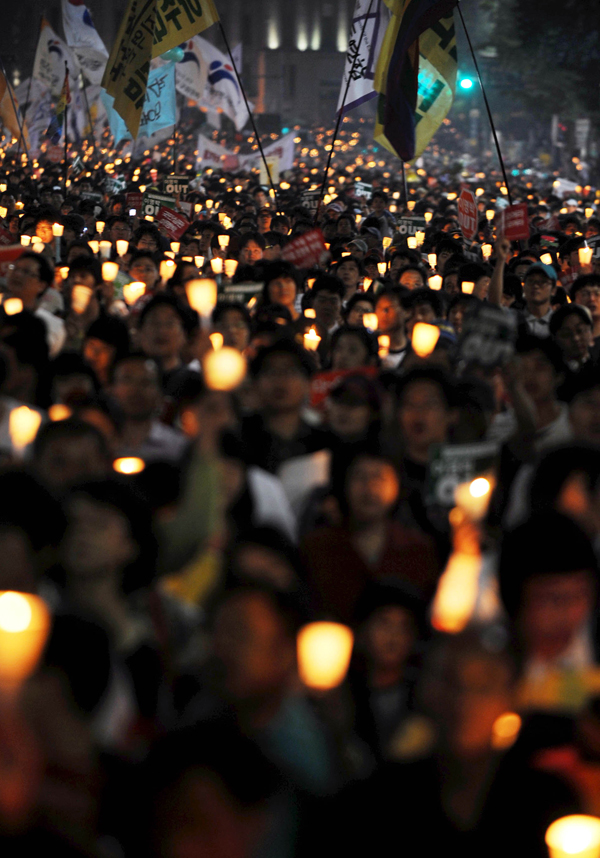 | ▲ 촛불의 여름밤 / '72시간 릴레이 국민행동' 미국산 쇠고기 수입 반대 촛불 문화제가 열리고 있는 7일 오후 서울 시청 앞에 모인 시민들이 가두행진을 시작하고 있다. ⓒ뉴시스 | ||
