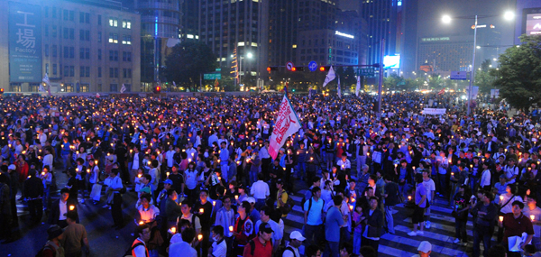 | ▲ 촛불문화제, 삼일째 / '72시간 릴레이 국민행동' 미국산 쇠고기 수입 반대 촛불 문화제 삼일째인 7일 오후 참가자들이 촛불을 들고 서울광장을 가득 메우고 있다. ⓒ뉴시스 | ||