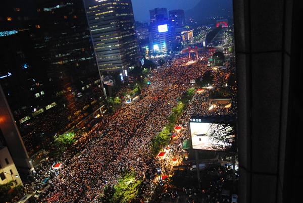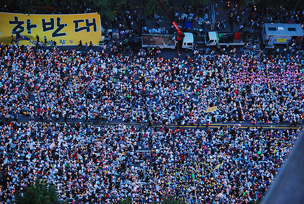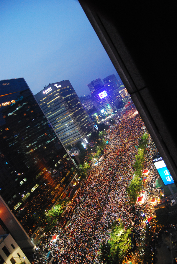 | ▲ 6·10 촛불행진이 열리고 있는 서울 시청 앞 세종로 거리(프레스센터에서 본 모습) | ||
