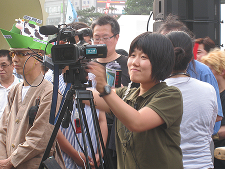 ▲ 한겨레영상취재팀이 6·10항쟁 21돌 기념일인 10일 오후 서울 청계광장에서 한겨레 주최 시민 자유발언대를 인터넷으로 생중계하고 있다. (사진=한겨레신문 제공) |