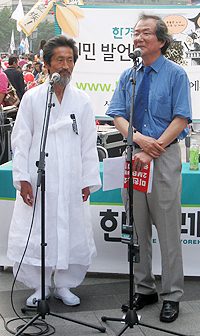 ▲ 지난 10일 오후 서울 청계광장에서 열린 한겨레 주최 시민 자유발언대에서 진행을 맡은 홍세화 기획위원이 강기갑 민주노동당 의원과 인터뷰를 하고 있다. (사진=한겨레신문 제공) |