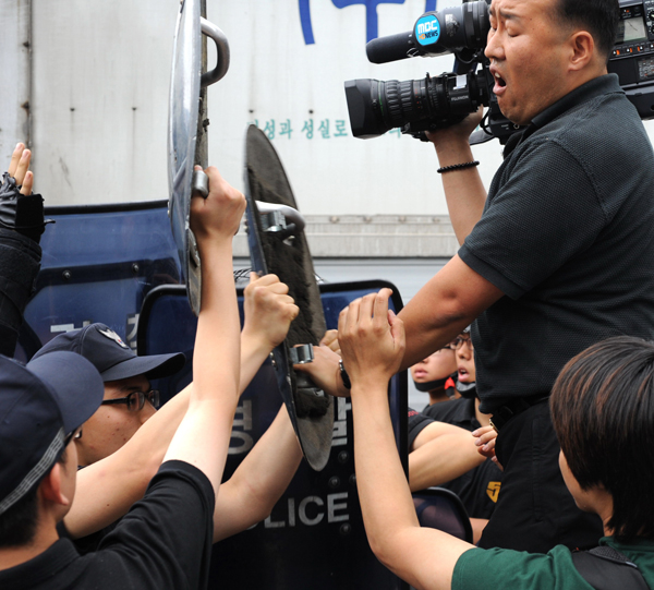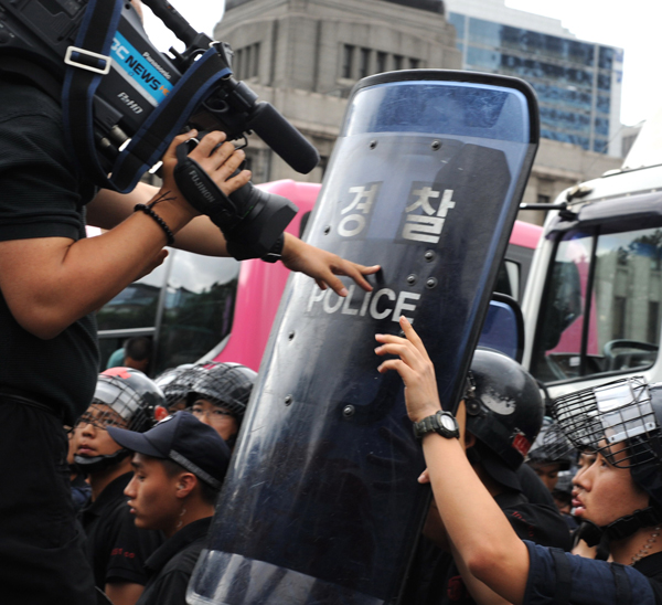 | ▲ / 방패로 막는 카메라 렌즈 / 29일 태평로에서 전경들이 촛불집회 차량견인 현장을 취재하던 MBC 카메라기자의 카메라를 막고 취재를 방해하고 있다. ⓒ뉴시스 | ||