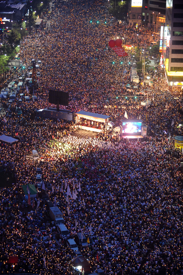 | ▲ / 하나의 촛불이 모여 거대한 바다 / 5일 저녁 서울시청 광장과 일원 도로에서 수많은 시민들이 모여 미국산 쇠고기 수입 장관 고시 철회 및 재협상을 촉구하는 촛불집회를 하고 있다.ⓒ뉴시스 | ||