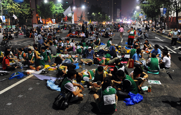 | ▲ / 거리에 누워 잠 청하는 시민들 / 6일 새벽 서울 태평로에서 '국민승리 선언 위한 범국민 촛불문화제'를 마친 시민들이 남아 문화제를 이어가고 있다. 일부 시민들은 밤이 늦자 거리에 누워 잠을 청하고 있다. ⓒ뉴시스 | ||