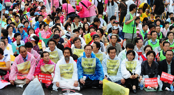 | ▲ / 구회 외치는 통합민주당 / 5일 오후 서울시청 앞 광장에서 시민사회단체와 종교계, 야당 및 노동계 등이 참여한 가운데 열린 '7.5 국민승리선언 범국민촛불대행진'에 참석한 통합민주당 의원들이 구호를 외치고 있다. ⓒ뉴시스 | ||
