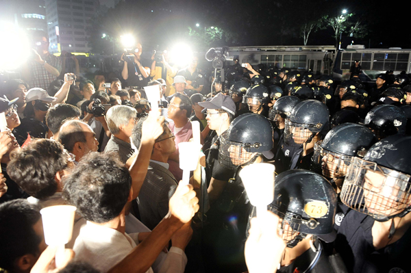 | ▲ / 제60번째 경찰과 대치 벌이는 촛불들 / 촛불집회가 열린 6일 저녁 서울광장에서 참가자들이 행진을 벌이던중 경찰과 대치를 벌이고 있다. ⓒ뉴시스 | ||