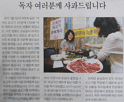 중앙은 “하지만 손님들이 모두 미국산 쇠고기를 주문했기 때문에 음식점 상황을 독자들에게 전달해야 한다는 판단에서 잘못을 저질렀다”며 “독자 여러분께 머리 숙여 깊이 사과드린다”고 덧붙였다.