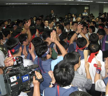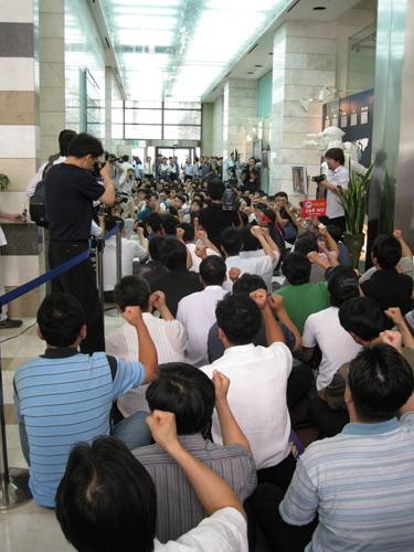 YTN노조(위원장 박경석) 조합원 1백여명과 네티즌 2백여명, 언론노조 지본부장 등 3백50여명은 1층 로비에서 “방송장악 음모저지”와 “구본홍 퇴진” 등을 요구하며 농성중이다.