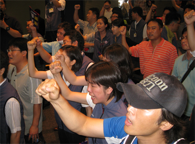주총 사회자인 채문석 경영기획실 팀장은 이날 오전 9시 용역업체 직원 2백여명이 단상을 에워싼 상태에서 “주주 참여 57.25%로 총회가 성립됐음을 선언한다”며 개회를 선포했다.
