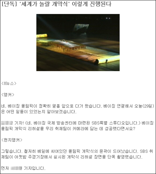 SBS는 이날 메인뉴스인 ‘8시뉴스’의 12, 13번째 리포트에서 단독으로 ‘‘세계가 놀랄 개막식’ 이렇게 진행 된다’, ‘중국의 저력을 담다…‘전율의 메스게임’’을 보도했다.