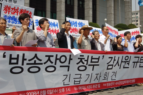 방송장악.네티즌탄압저지범국민행동은 이날 KBS 본관 앞에서 감사원 특감 결과에 대한 규탄 기자회견을 열고 “KBS 이사회는 감사원의 초법적 결정을 받아들여 역사에 오점을 남기는 어리석은 행동을 즉각 중단해야 한다”고 주장했다.