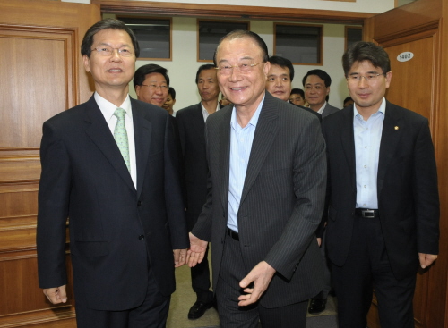 ▲ 최시중 방송통신위원장(사진 가운데)이 6일 방통위를 방문한 민주당 언론장악저지대책위 의원들을 맞이하고 있다. (사진=뉴시스) |