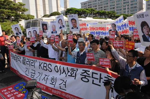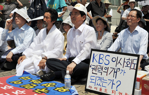 | ▲ KBS이사회 중단하라 / 8일 오전 여의도 KBS 본관 앞에서 방송장악 ,네티즌탄압저지범국민본부는 방송장악 들러리 KBS이사회 중단하라며 기자회견을 하고 있다. 본관 제1회의실에서는 정연주 사장의 해임 제청에 대한 KBS 이사들의 임시이사회가 열리고 있다. ⓒ뉴시스 | ||