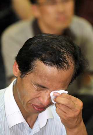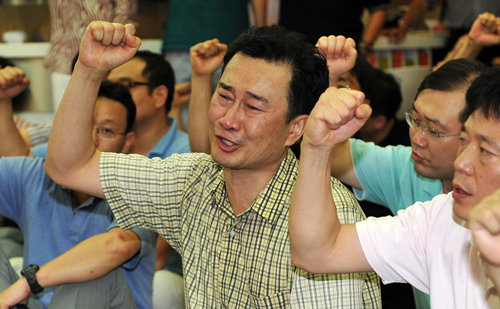 | ▲ 전 MBC 사장의 눈물 / 정연주 KBS 사장에 대한 해임제청안이 통과된 8일 오후 서울 여의도 KBS 본관 로비에서 열린 해임 반대집회에서 전 MBC 사장 최문순 의원이 눈물을 닦고 있다. ⓒ뉴시스 | ||