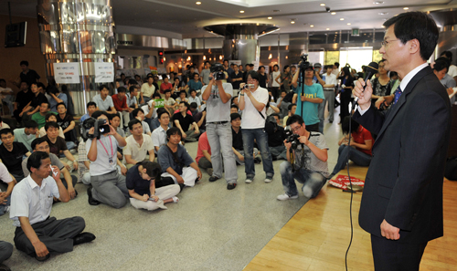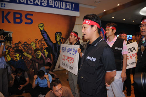 | ▲ 경찰은 KBS 민주광장에서 나가 주시요 / 8일 오전 여의도 KBS 본관 제1회의실에서 정연주 사장의 해임 제청에 대한 KBS 이사들의 임시이사회가 열리고 있는 가운데 로비 민주광장을 점령한 사복경찰들에게 노조원들이 나가라는 요구에 고개를 수그리고 앉아 있다. ⓒ뉴시스 | ||
