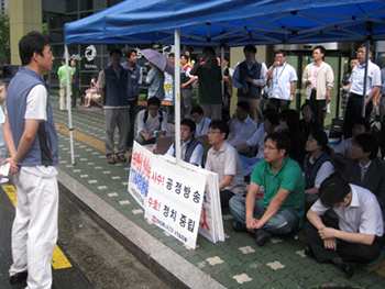 ▲ “비가 오는 날에도 계속 됩니다.” YTN 노조(위원장 노종면)가 비가 내리는 중에도 13일 오전 8시 서울 남대문로 YTN 사옥 후문에서 새 집행부 출정식을 겸한 ‘구본홍 출근 저지 투쟁’ 집회를 벌이고 있다. |