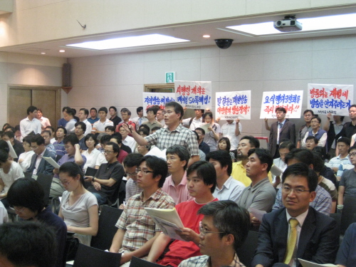 2시간30여분동안 패널과 언론노조·현업인간의 팽팽한 논박 끝에 결국 오후4시30분 사회자인 한양대 정대철 교수(신문방송학)가 “다음으로 연기한다”고 밝히면서 공청회가 중단됐다.